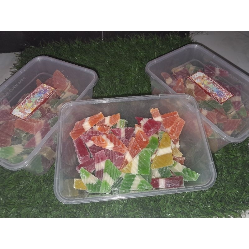 jelly kering pelangi dengan 3 lapis warna.teksturnya renyah dan manis.cocok disajikan saat berkumpul bersama keluarga,oleh-oleh maupun saat lebaran nanti ya , netto 450gram