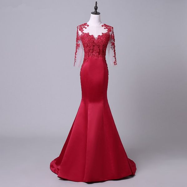 jewel neck tulle satin mermaid evening dresses with appliques 2018 long sleeves evening gowns elegant formal dress, Black;red