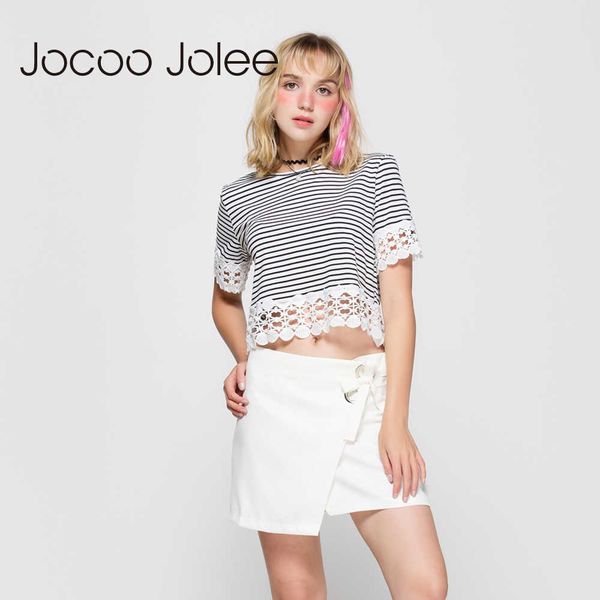 jocoo jolee stripe summer t-shirt women casual lady lace tees cotton tshirt hollow out short sleeve women tee 210619, White