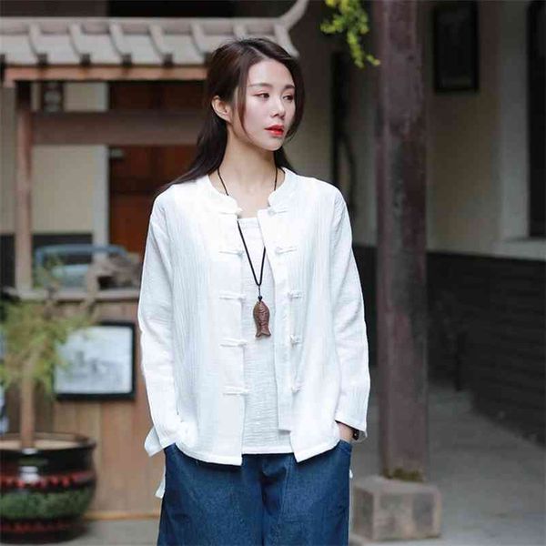 johnature 6 color women shirts cotton linen stand long sleeve button blouses spring chinese style solid color shirt 210521, White