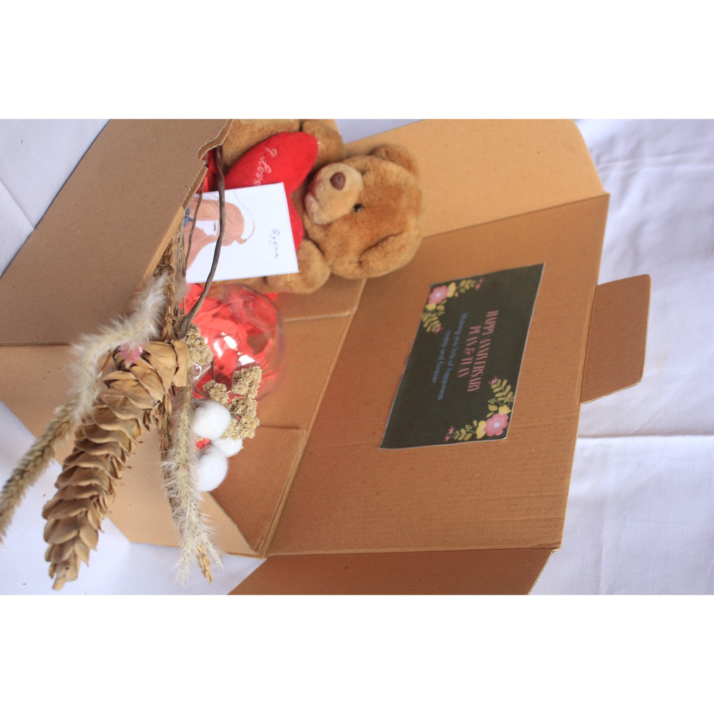 You will get dried flowers vase, doll, card name, greeting card, and sand.