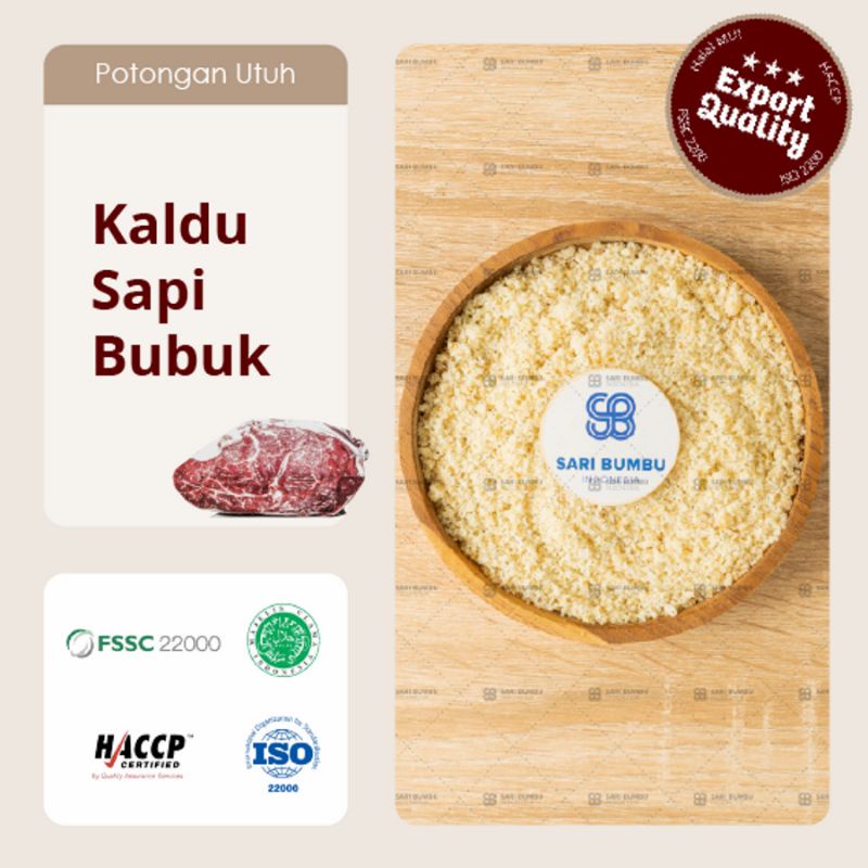 Kaldu Sapi Bubuk yang di proses dengan sangat higienis dengan standar mutu Internasional. Kaldu Sapi Bubuk ini murni tanpa campuran bahan kimia dengan komposisi Garam, Gula, Lemak & Ekstrak Sapi dan melewati 3 tahapan pembersihan dengan mesin standar produksi untuk Ekspor ke Jepang. Cita rasa original dengan aroma yang berkelas membuat bumbu ini biasa digunakan untuk masakan yang memiliki cita rasa khas dan biasa digunakan untuk Kuliner berkuah atau aneka hidangan lainnya.