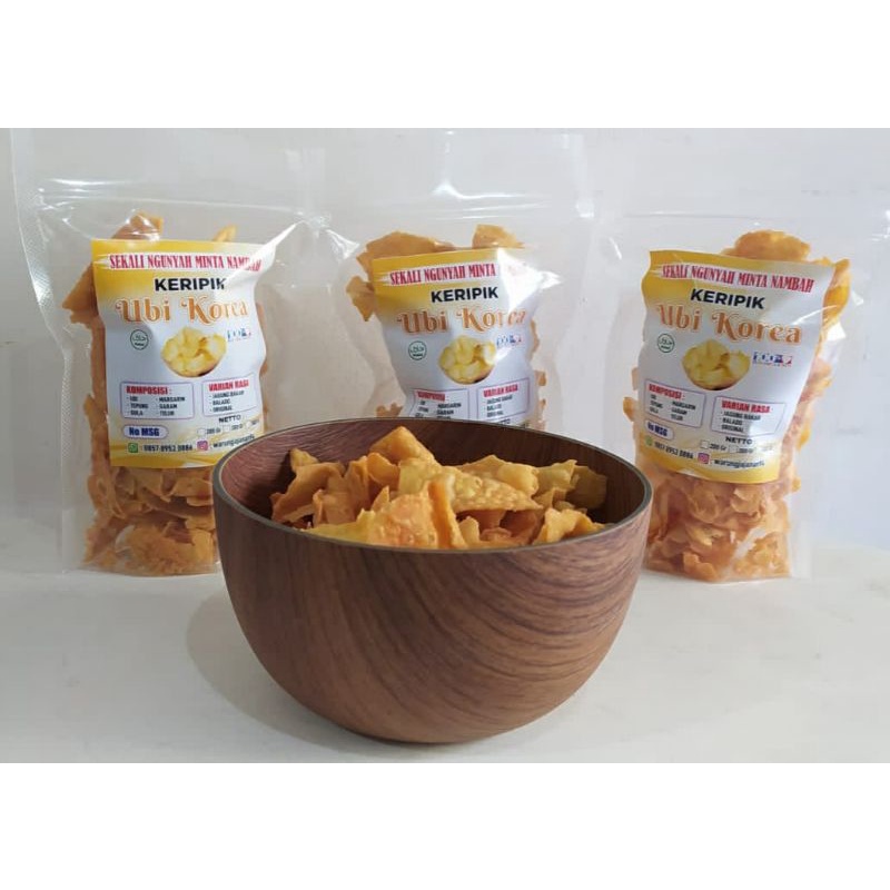Terbuat dari bahan-bahan pilihan dengan kualitas terbaik,bahan khusus ubi korea yang Lezat dan bernutrisi, dengan citarasa nusantara dan komposisi terbaik,Tanpa MSG sehat dan aman di konsumsi oleh semua usia.