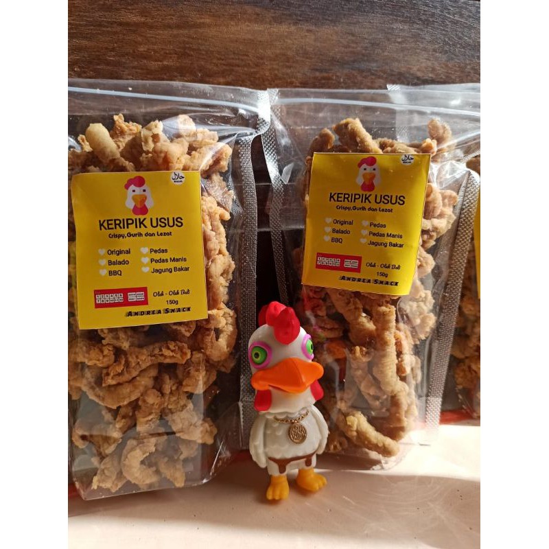 keripik usus terbuat dari keripik usus,yang diproses menggunakan sistem modern,juga dikamas dengan cara praktis,agar penikmat keripik bisa menikmati tanpa harus ribet.