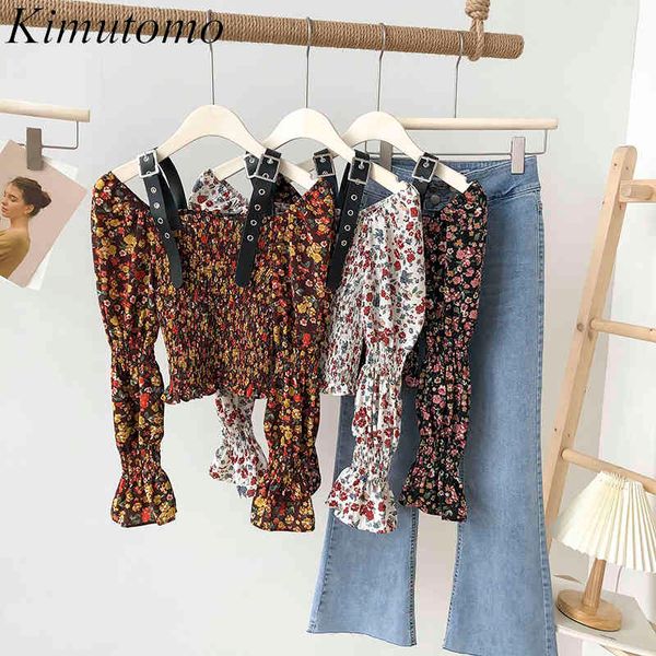 kimutomo fashion floral printing blouse women korean style female double shoulder strap square collar puff sleeve short shirt 210521, White
