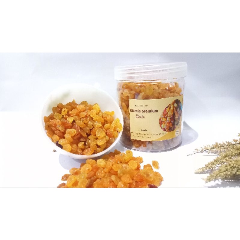 kismis dengan rasa manis, bentuk bulat dan warna kuning keemasan.