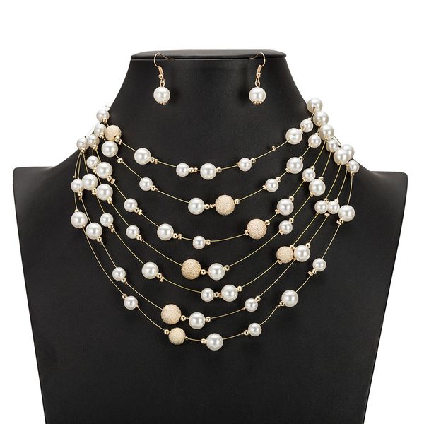 kmvexo 2019 new fashion gold multi layer chains imitation pearl jewelry sets for women party wedding bride necklace earrings set, Silver