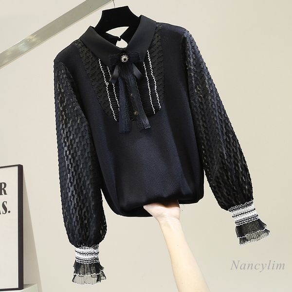 knits jacquard chiffon long sleeve stitching bow sweater thin knitted shirt women elegant spring white black nancylim