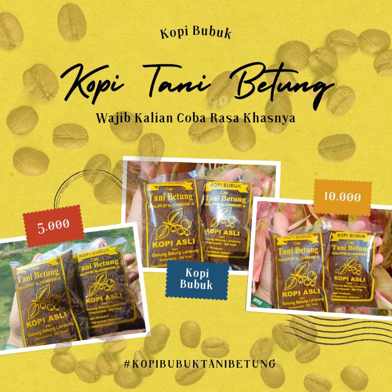 kopi Bubuk tani betung diproduksi diwiyono, kecamatan gedong tataan, kabupaten pesawaran, provinsi lampung. Biji Kopi ini didapatkan dari petani sekitar yang berkualitas, dalam proses penyangraiannya masih menggunakan cara manual, sehingga kopi bubuk ini memiliki cita rasa yang khas.