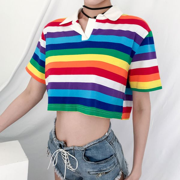 korean women's polo shirt fashion women turn-down collar short sleeve rainbow striped print short crop top, White