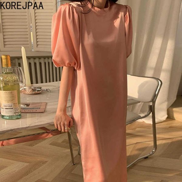 korejpaa women dress summer korean chic girls sweet gentle round neck lace open back glossy split puff sleeve vestidos 210526, Black;gray