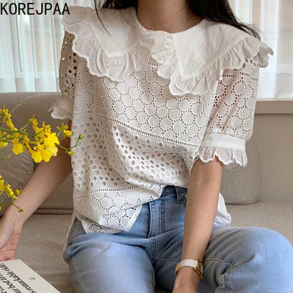 korejpaa women shirt summer korean chic french temperament doll collar lace hollow crochet all-match puff sleeve blouses 210526, White