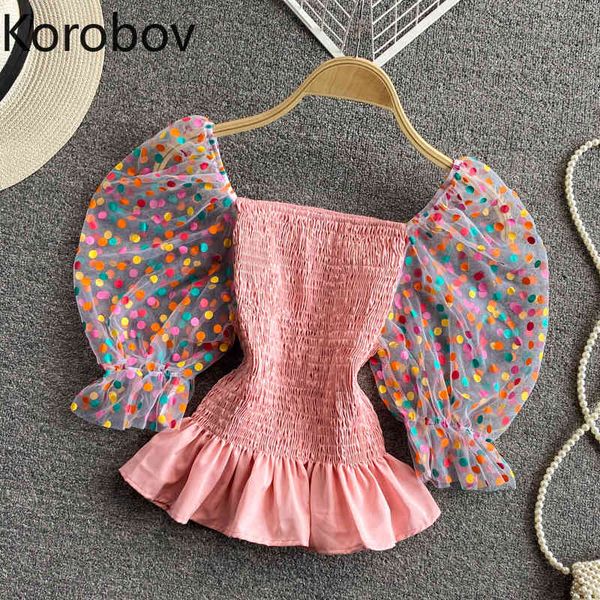 korobov summer sweet women blouses korean square collar puff sleeve crop shirts dot mesh patchwork chiffon blusas mujer 210430, White