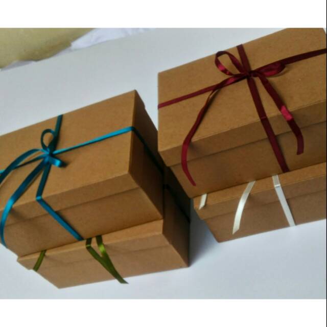 * bahan karton dengan tebal -+ 2mm, lapisan dalam menggunakan kertas cokelat, lapisan luar menggunakan paper craft warna cokelat dihias pita satin warna cokelat tua/merah maroon/off white/biru tua