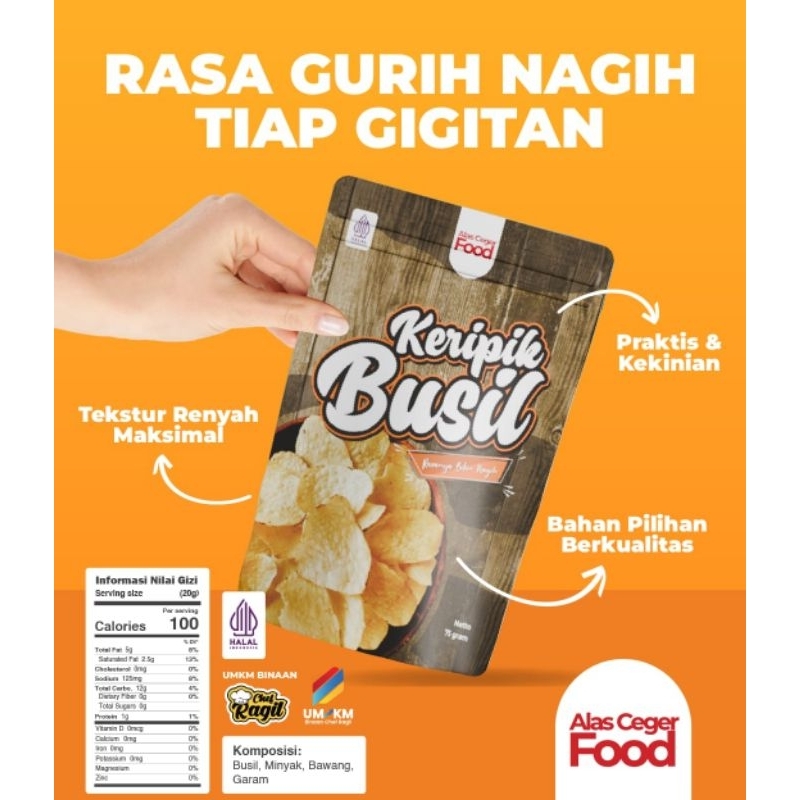 Berasal dari umbi busil / talas pilihan yang di iris tipis2. Rasa gurih, renyah dan cenderung empuk. Begitu digigit terasa sekali khas busilnya cocok banget dijadiin temen ngemil kamu