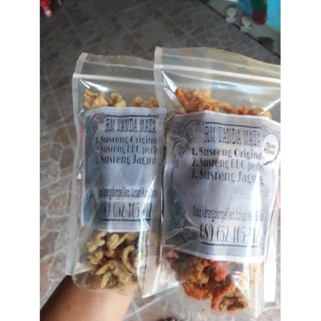 RM Tanda mata menyediakan berbagai macam jajanan yg brbahan dasar Usus ayam yg pastinya memiliki cita rasa aduhai banget. salah satu prodaknya adalah Susreng (usus goreng) deng rasa