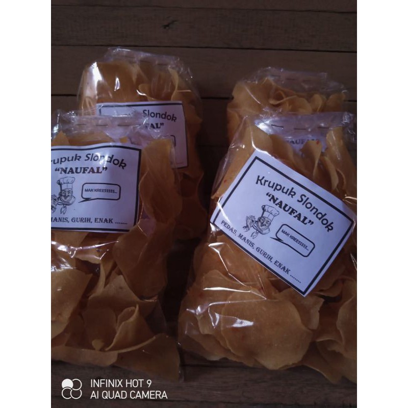 250g Rp 9000 , 500g Rp 17000 , 1kg Rp 32000. krupuk slondok pedas manis cemilan buat tmn nonton TV, dijamin kresss,