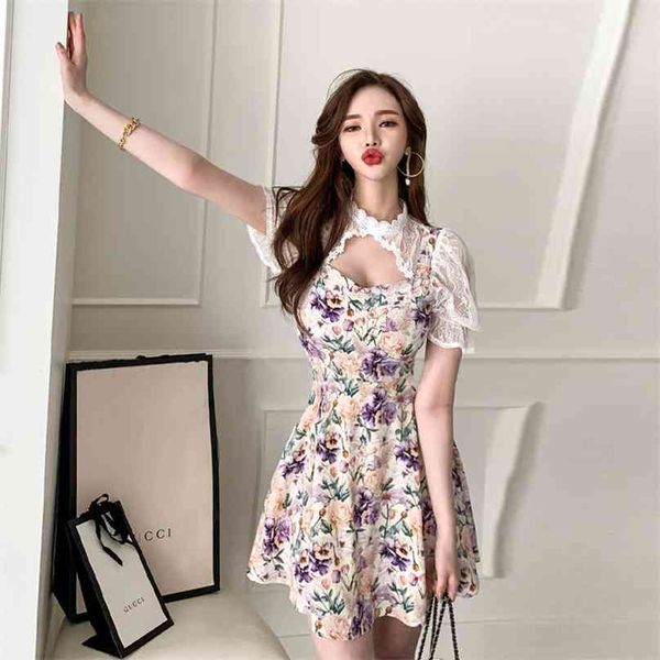 lace elegant print dress for women summer korea ruffle sleeveless crew neck hollow out sundress a line dresses 210602, Black;gray