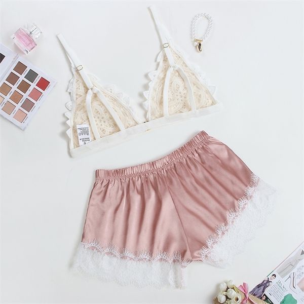 lace set pajamas silky satin pajamas thin flower bra and sleeveless shorts pajamas lingerie womens underwear-pink, Black;white