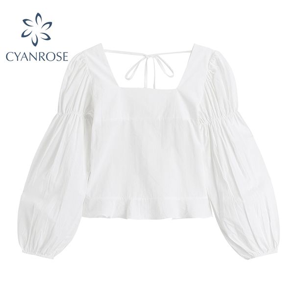 lace-up retro square collar women's blouses korean slim casual puff long sleeve shirts summer elastic crop solid blusas 210417, White