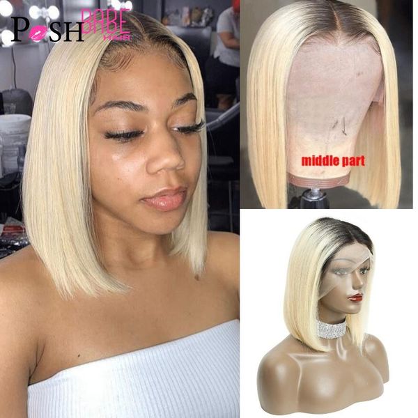 lace wigs 1b 613 ombre blonde front wig short bob 13x4 frontal pre plucked remy brazilian hair for women, Black;brown