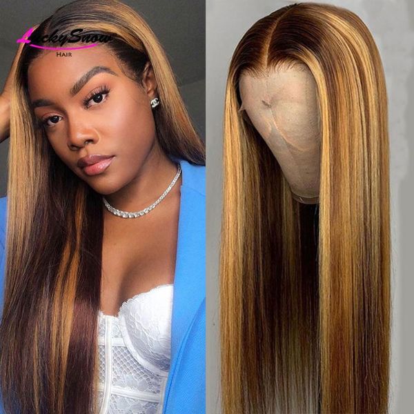 lace wigs highlight wig brown colored human hair 4x4 closure straight honey blonde front, Black;brown