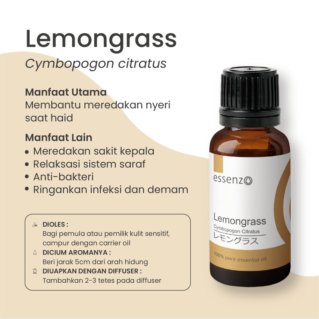 Lemongrass essential oil diperoleh dari distilasi sereh (lemongrass), berwarna kuning jernih serta memiliki kemampuan mempertajam mental. Sebagai salah satu minyak esensial yang memiliki sifat memurnikan dan membersihkan, lemongrass oil dapat pula digunakan untuk meningkatkan kesehatan kulit. Kandungan citral dalam minyak esensial ini mampu menenangkan dan menjernihkan pikiran. Lemongrass essential oil memiliki efek menyeimbangkan energi tubuh dan bisa digunakan untuk mencegah mabuk dan ketidaknyamanan saat melakukan perjalanan jauh.#solusipms#antibakteri#essenzo#praktis#solusidemam#relaksasisaraf#solusisakitkepala#praktis