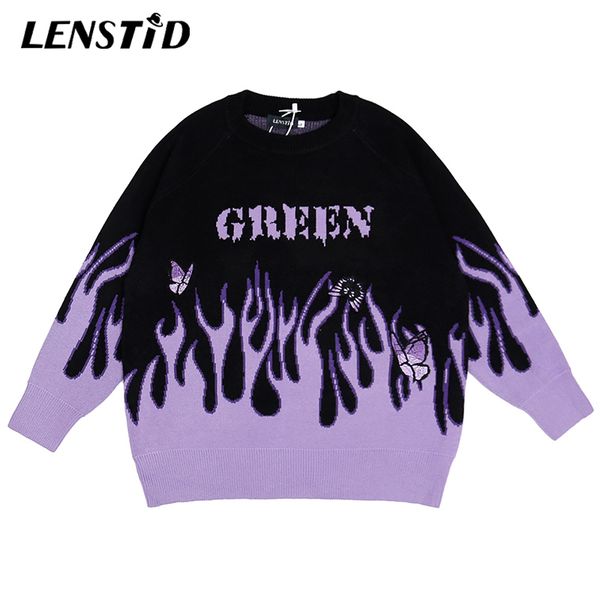 lenstid men hip hop knitted jumper sweaters fire flame butterfly embroidery streetwear harajuku autumn hispter casual pullovers 201201, White;black