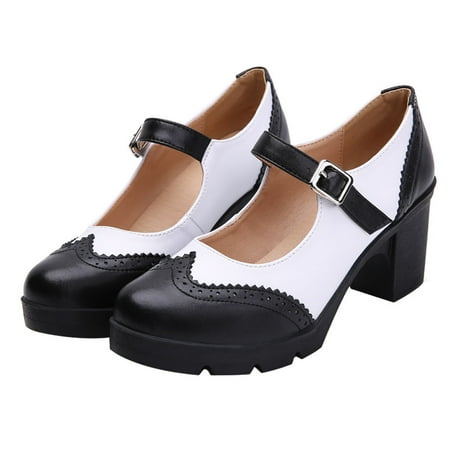 1 Pair Lady s Platform Chunky Heels Round-toe Strap Buckle Shoes Black White