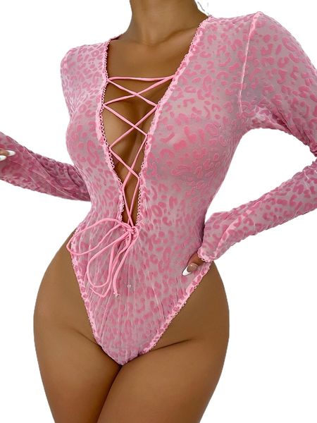 leopard print lace up front mesh teddy bodysuit a35f#, Black;red