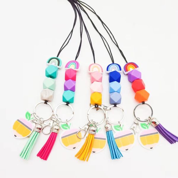 lforeign trade silicone rainbow lanyard acrylic apple pencil print tassel pendant necklace, Silver