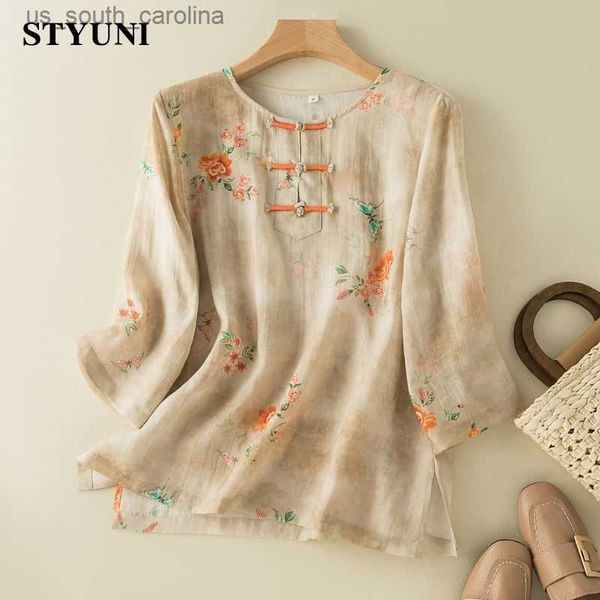 linen chinoiserie print casual women's blouse shirt summer short sleeve loose round neck buttons female clothing blouses l230522, White