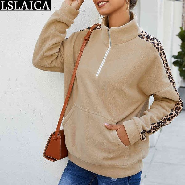 long sleeve autumn clothes women stand collar zipper leopard print patchwork pullover loose pockets streetwear sweatshirts 210520, Black