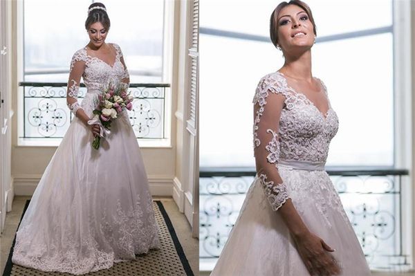 long sleeves lace appliques beaded sheer crew neck bridal gowns with sweep train new arrival vestios de novia a-line wedding dresses, White