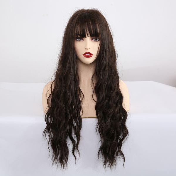 long synthetic water wave wigs with bangs natural curly dark brown wigs for women cosplay wigs heat resistant fiber, Black
