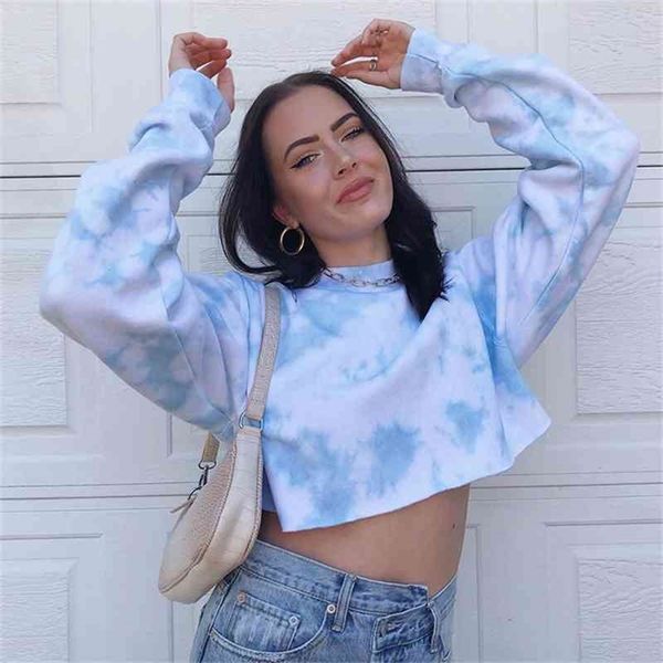 lusofie tie dye printed long sleeve sweatshirt women casual loose crop sweat shirt streetwear autumn hoodies ladies 210322, White