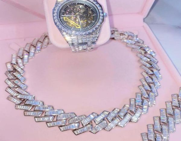 luxury 18mm baguette cuban link chan necklace iced out bracelets 14k white gold icy cubic zirconia hiphop jewelry7829293, Silver
