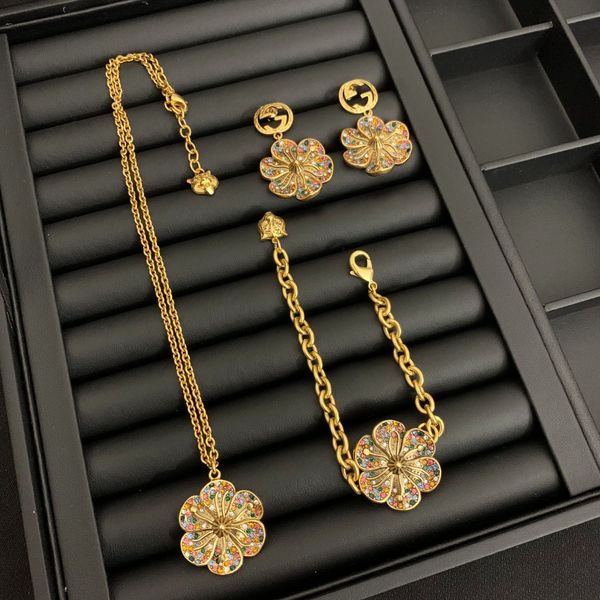 luxury design earrings retro color diamond flower necklace women double g earrings women flower bracelet of post, Golden;silver