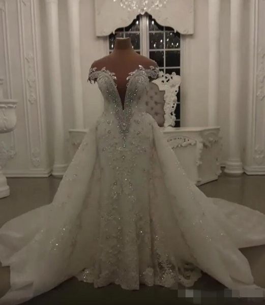luxury major beading a-line wedding dresses with overskirt pluning v neck sweep train lace applique 2019 custom made wedding gown, White