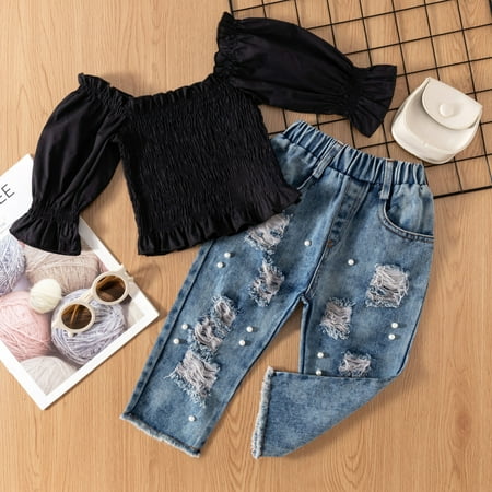 Hunpta Toddler Kids Girls 1/2 Sleeve Off Shoulder T Shirt Tops Hole Denim Jeans Long Pants 2PCS Outfits Set 1-6 Years