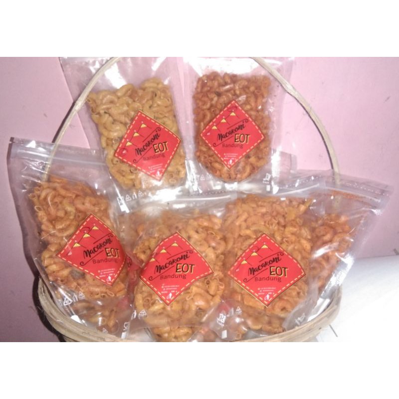 macaroni dengan aroma daun jeruk variant rasa original, dan pedas sedang dan sangat pedas
