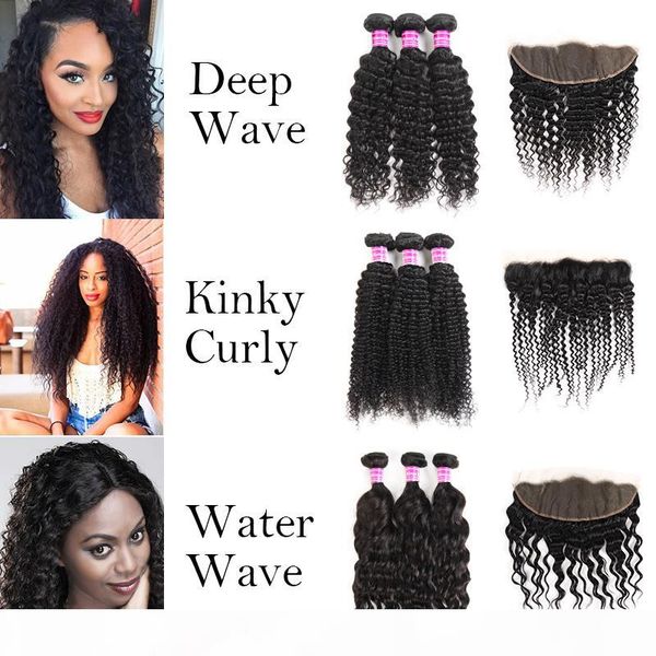 malaysian 8a deep water wave kinky curly human virgin hair weave bundles with part frontal ear to ear hair extensions, Black
