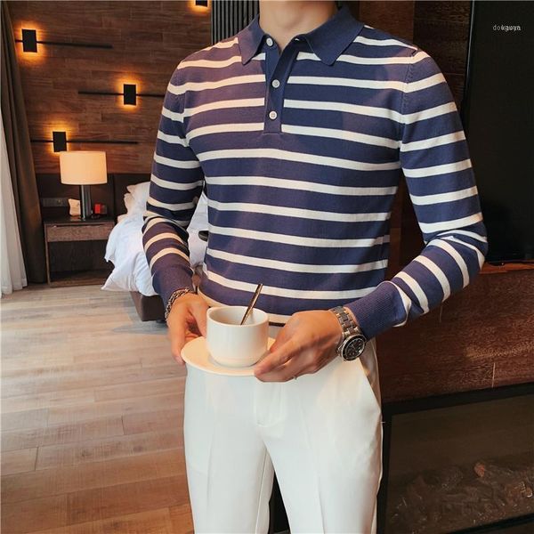 male casual turn-down collar pullover thin sweater men's fashion slim fit stripe knit bottom sweater1, White;black