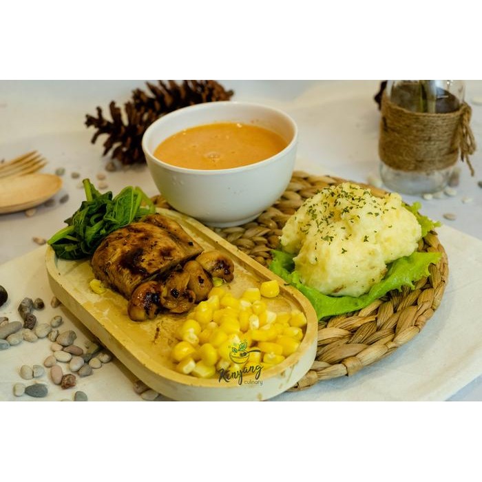 mashed potato dengan dada ayam yang dipanggang dan sayuran seperti jamur, bayam dan jagung dilengkapi dengan saus