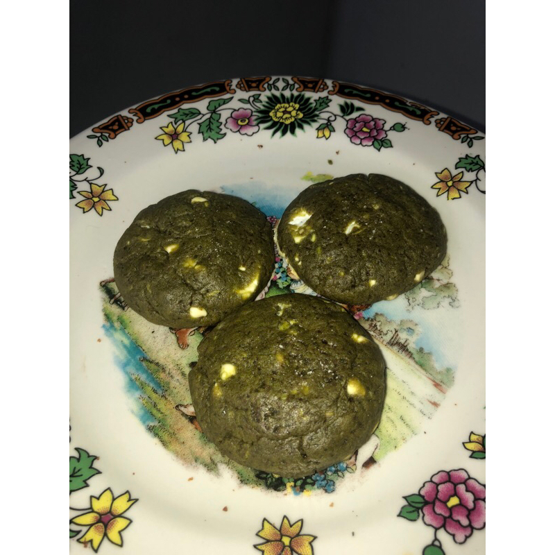 cookiedough yang dipadukan dengan bubuk matcha serta white chocolate dan white chocochips.