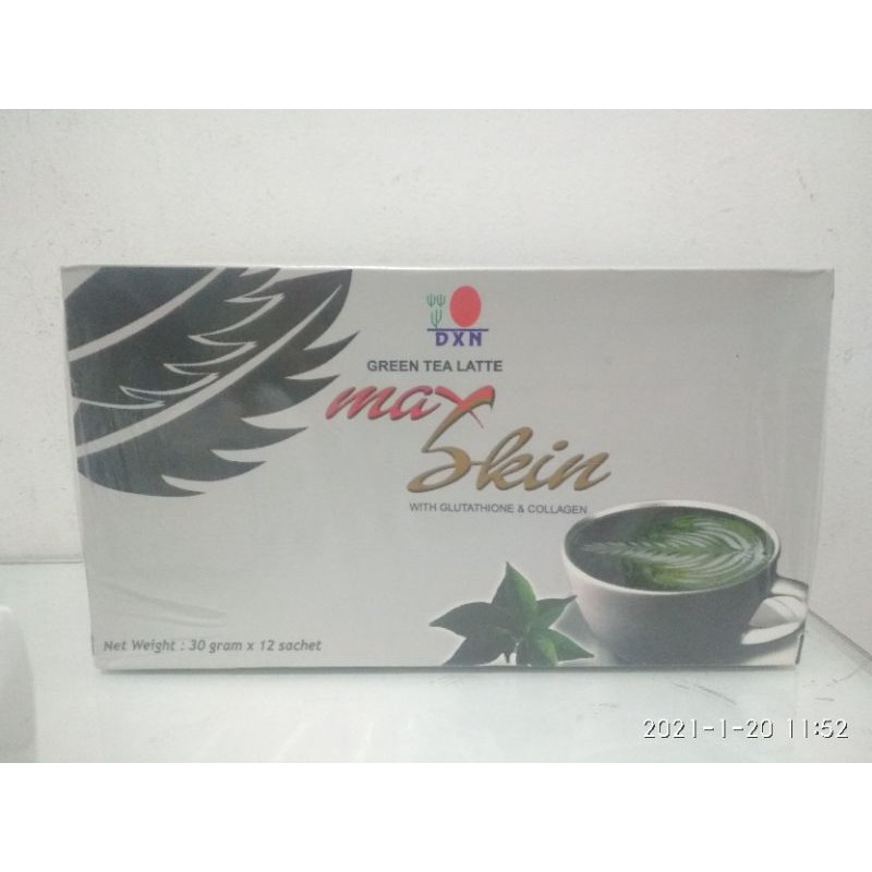 green tea latte max skin Dxn merupakan minuman serbuk pracampur unik yang diformulasikan dari glutathione collagen dan disajikan dalam green tea latte, minuman ini sangat berguna untuk menjaga kesehatan kulit anda