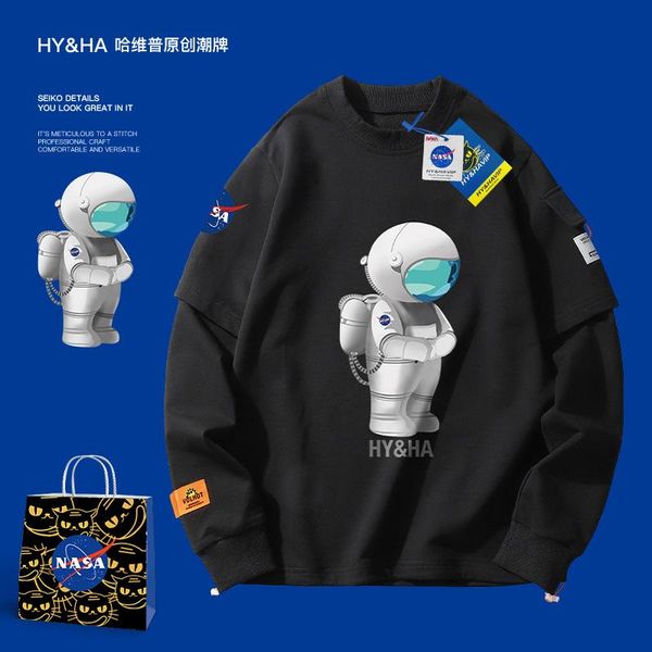 men's hoodies & sweatshirts fake two piece sweatshirt astronaut print round neck long sleeve pullover casual men clothing, Black