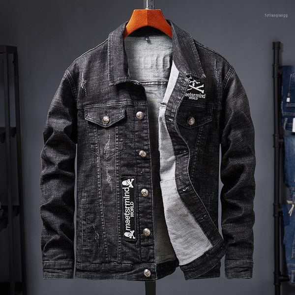 men's jackets black denim jacket skull pattern lapel long sleeve ripped single breasted personality fashion spring autumn male coat, Black;brown