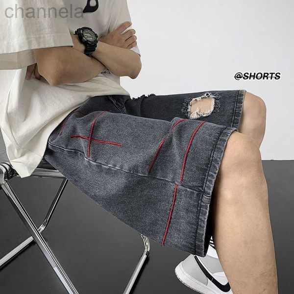 men's shorts 2023 summer new washed retro jeans casual loose straight hollow hole stripe cargo short pants y2k chic streetwear, White;black