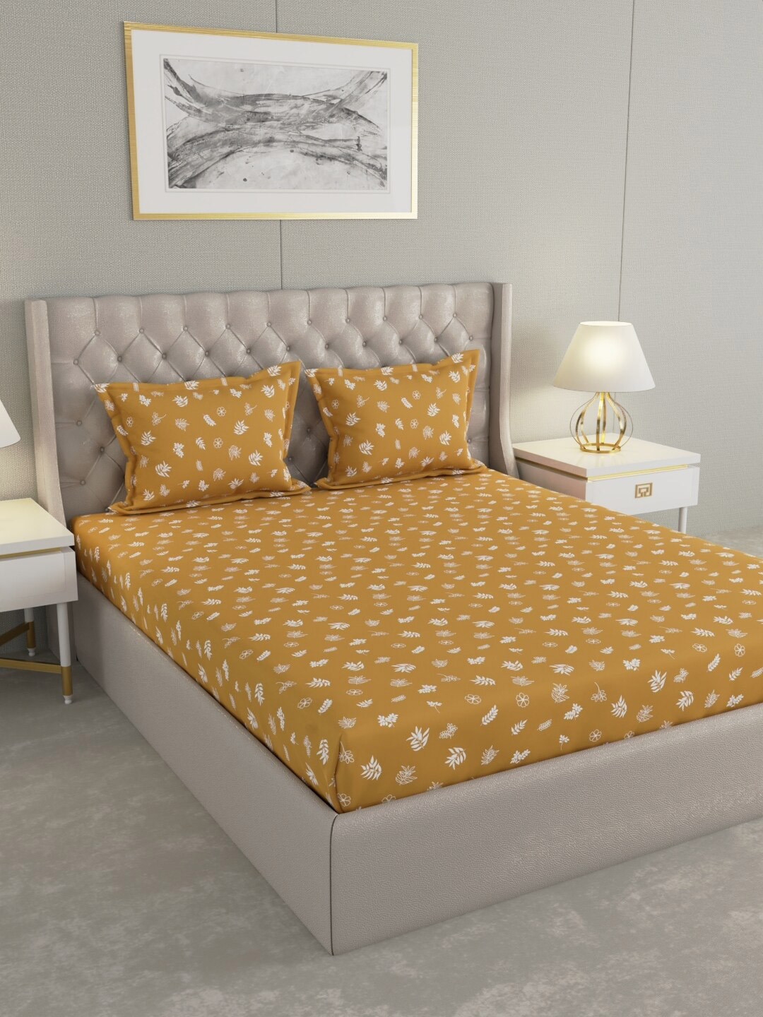 Raymond Home Mustard & White Floral Cotton 104 TC Queen Bedsheet with 2 Pillow Covers